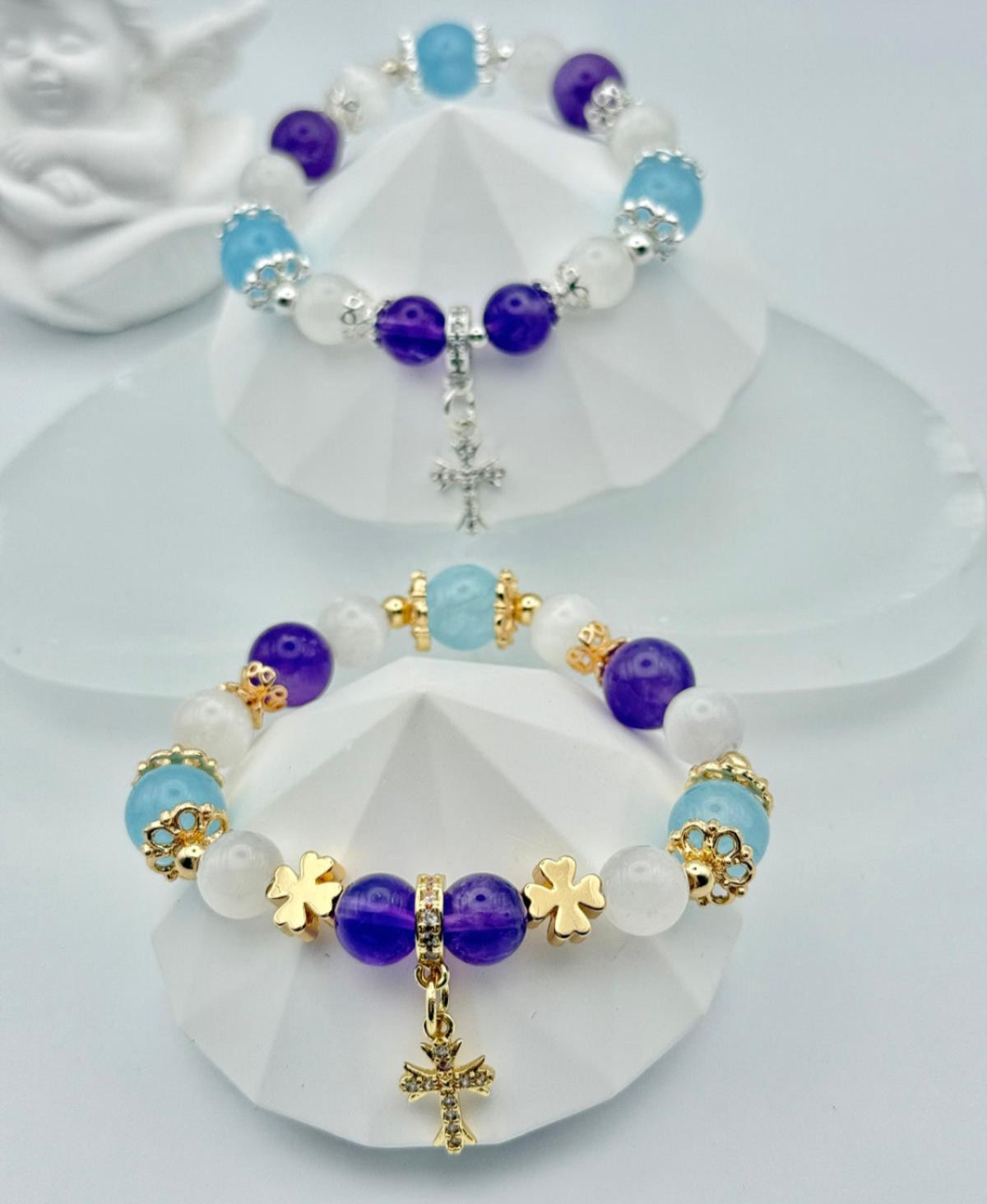 Crafted with calming Blue Chalcedony, royal Amethyst, and purifying Selenite, the Faith Over Fear bracelet is a radiant reminder that God’s presence is greater than any storm. Each bead is chosen to reflect trust, transformation, and divine peace, guiding you back to His promises every time fear whispers otherwise.